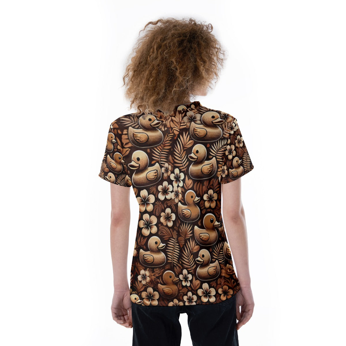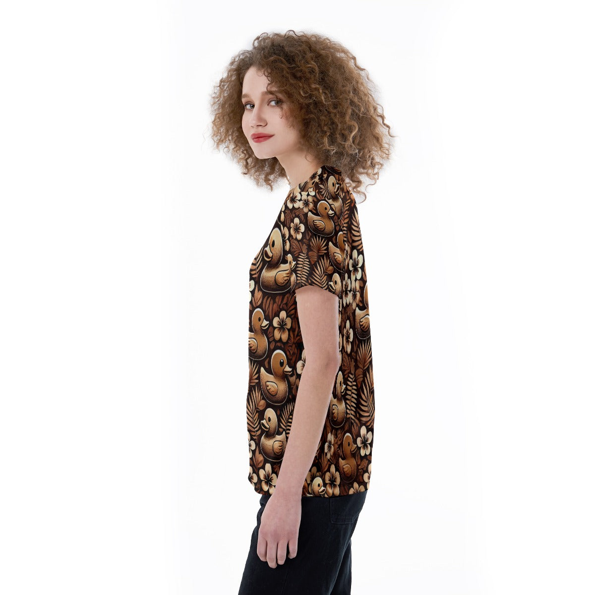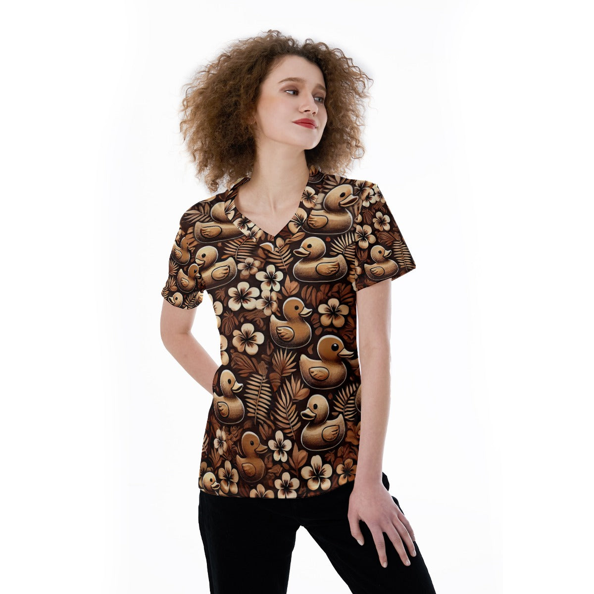 Embrace earthy tones with the Sandstone Jungle V-Neck Tee. Featuring shades of brown and beige, this charming design is adorned with rubber ducks, tropical florals, and ferns. The lightweight, soft fabric and loose fit make it a perfect pick for nature-inspired adventures or relaxed outings. This top runs small, so refer to measurements when ordering.