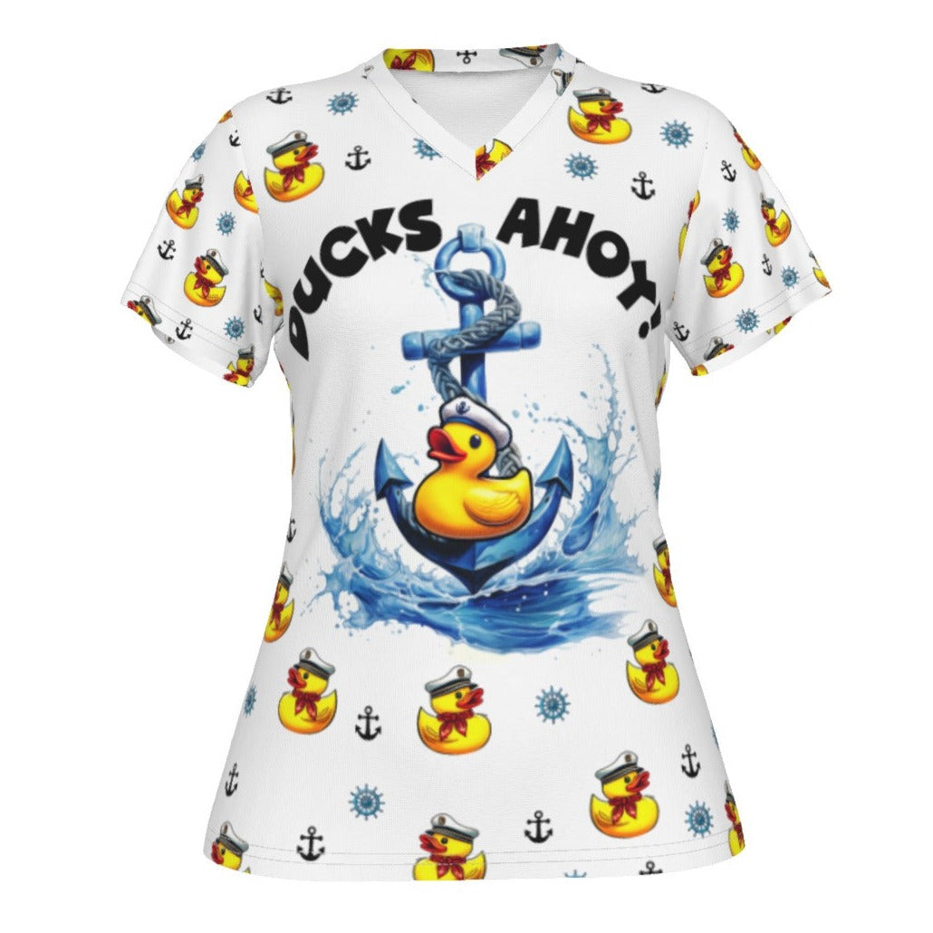 Set your sights on seafaring fun with our "Ducks Ahoy Adventure V-Neck Tee," the perfect gear for the playful at heart on the high seas. Splashed with a spirited "Ducks Ahoy!" and a buoyant rubber duck atop an anchor, this tee is a cheerful homage to the hidden duck game on cruises. Adorned with a pattern of tiny captain ducks, anchors, and ship's wheels, it's a treasure for those who delight in the whimsical side of cruising. Crafted for comfort with a flattering V-neck cut, it's just the right blend of maritime flair and casual style for your next deck party or shore excursion