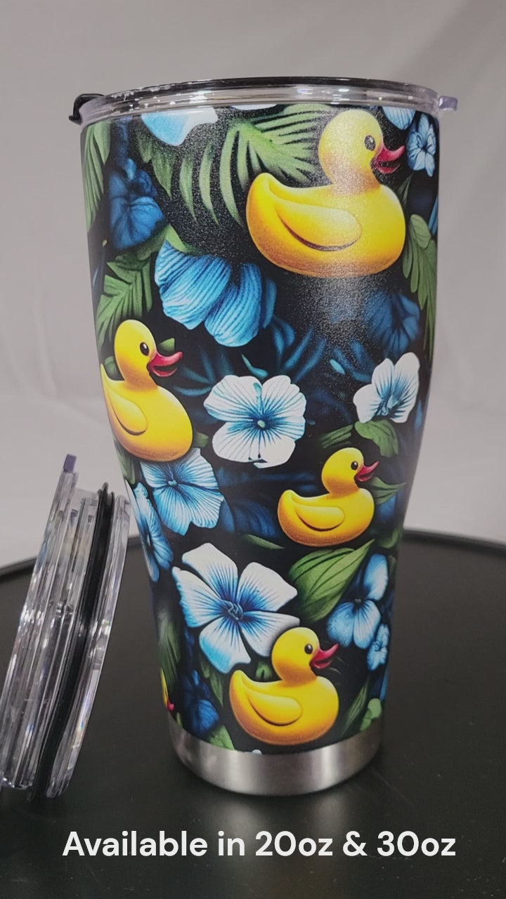 Uncover the playful side of duck hiding with our "Ducky Royal Blue Hawaiian Tumblers," the ultimate accessory for sneaky game lovers aboard a leisurely cruise. This tumbler is bursting with blue and white tropical flowers and cheerful rubber ducks, playing a game of hide and seek among the foliage.