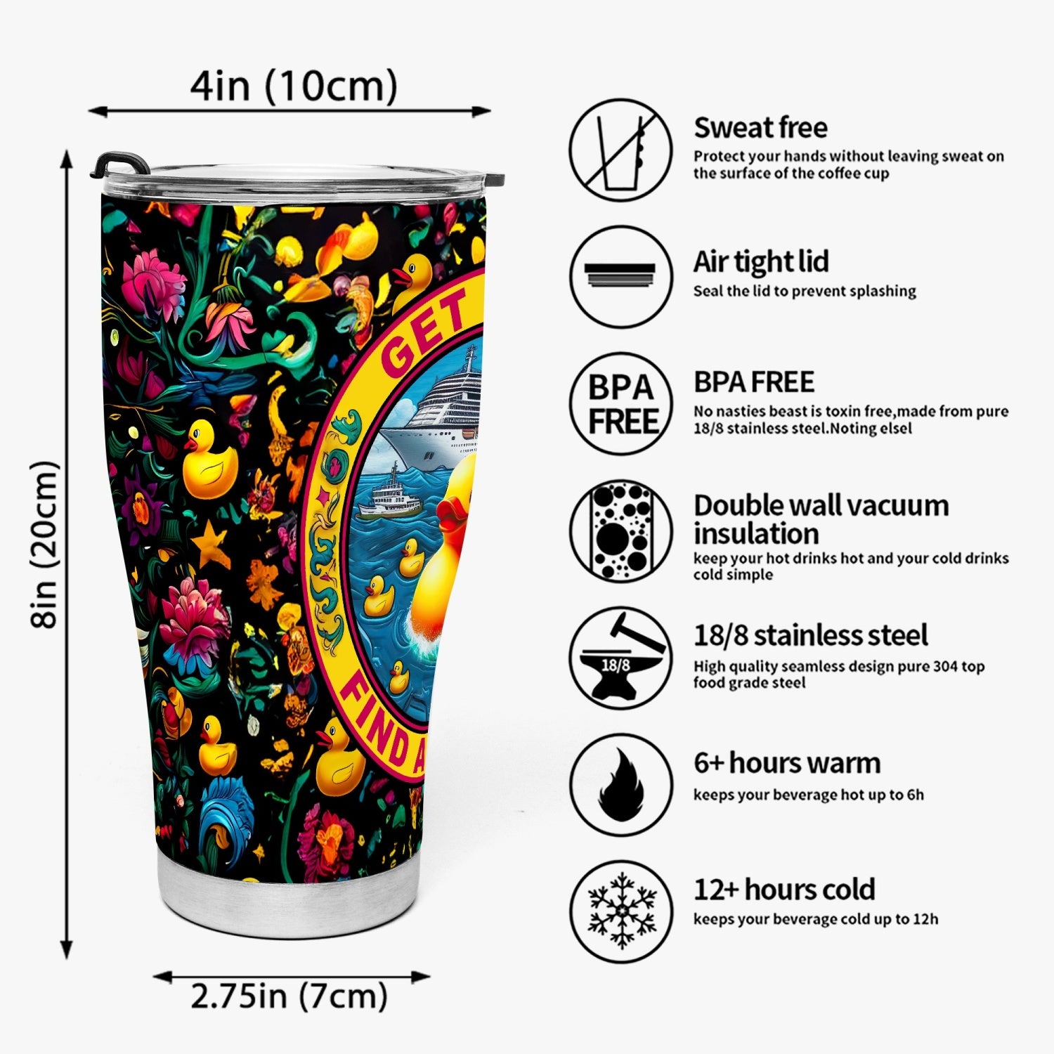 Adorned with a colorful blend of flowers and hidden ducks, this tumbler will bring joy and good fortune to any voyage. Crafted from stainless steel, it will keep your drinks perfectly chilled or steaming hot no matter where you wander.