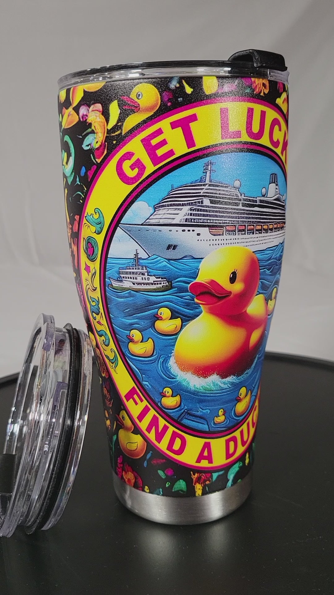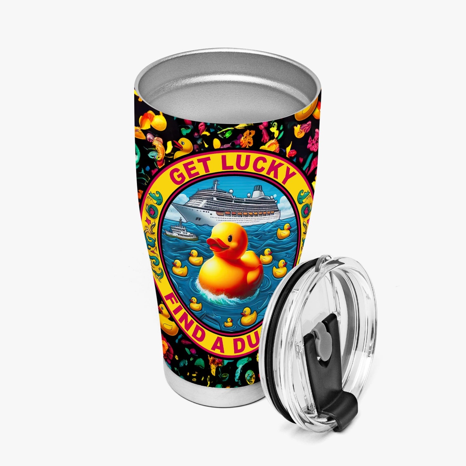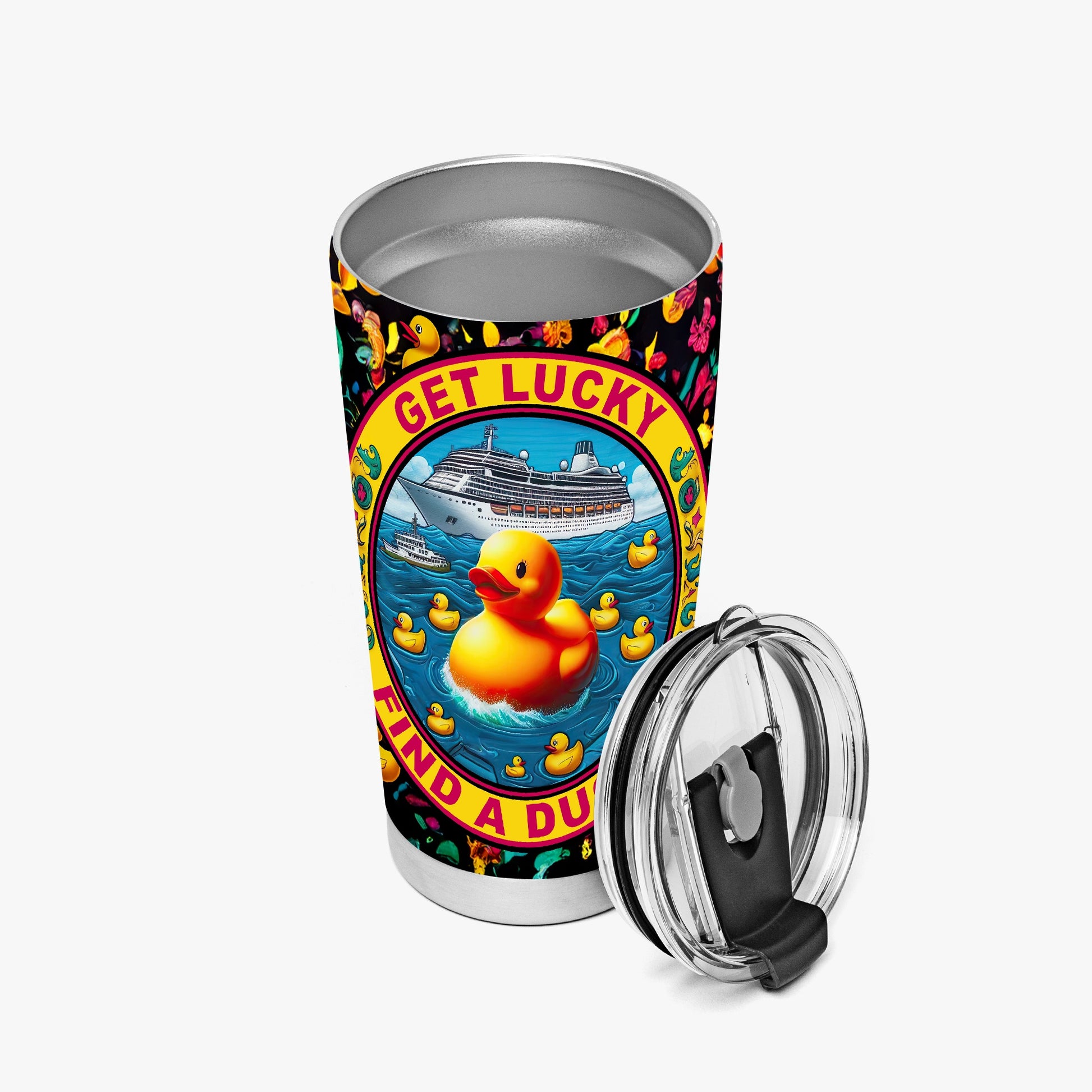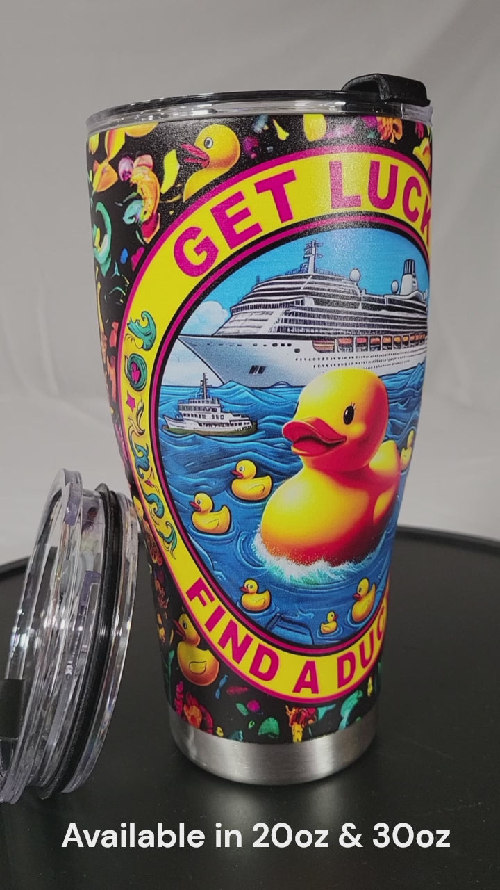 Embark on a whimsical journey with our "Get Lucky, Find a Ducky Tumbler," a bold addition for the free-spirited and adventurous. This vibrant tumbler boasts a cheery phrase "Get Lucky, Find a Ducky!" encircling a buoyant rubber duck, making it the perfect companion for duck-hunting on the high seas.