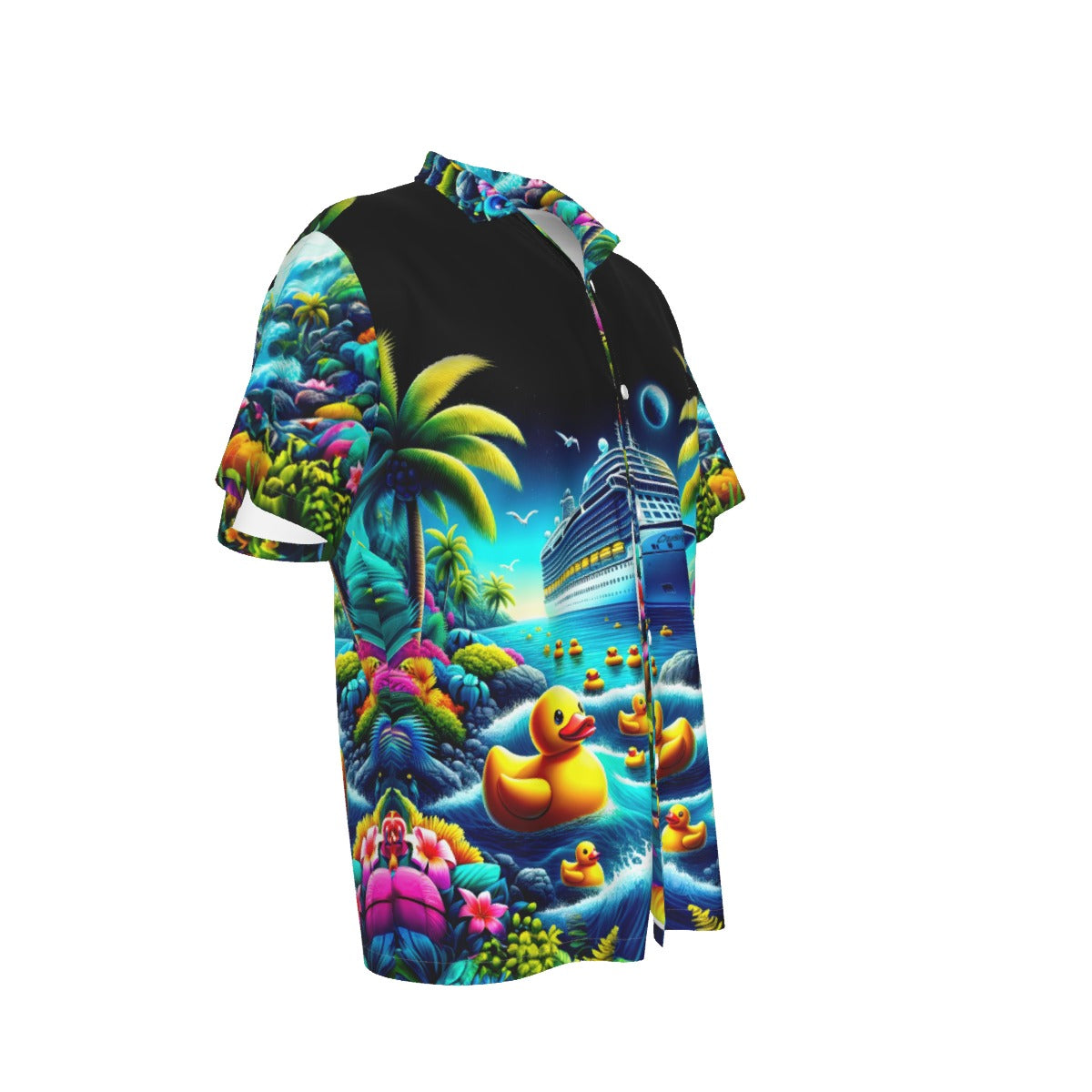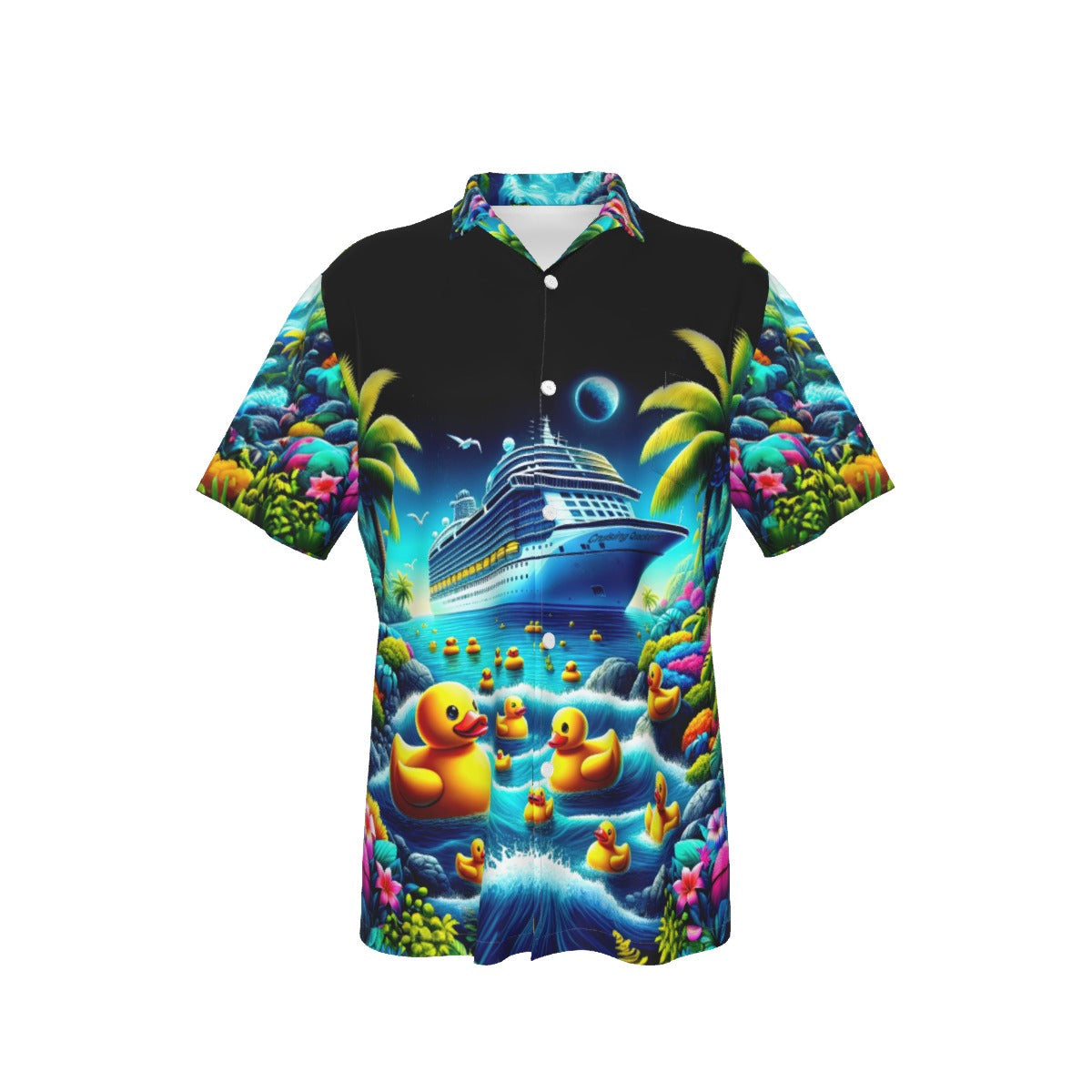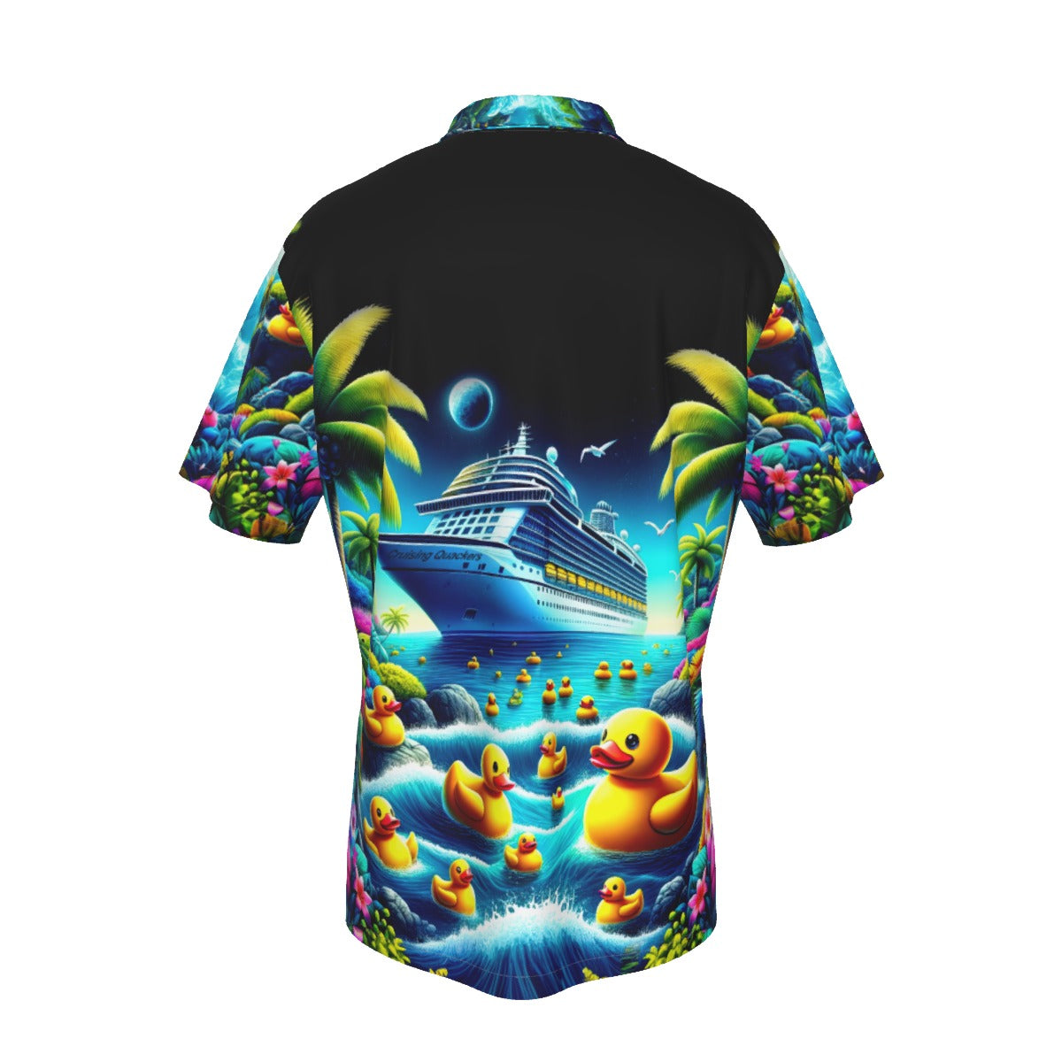 Join the secret society of duck hiders with our "Midnight Marina Duck Hideaway Shirt," where the thrill of the hunt meets tropical elegance. Adorned with a moonlit cruise ship and rubber ducks basking in the calm ocean waters, this shirt is a playful nod to the beloved onboard game.