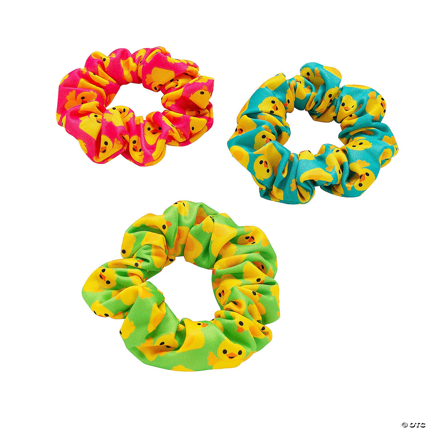 These adorable scrunchies feature a pattern of yellow ducks on a colorful background.