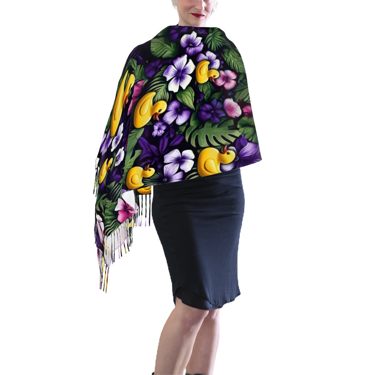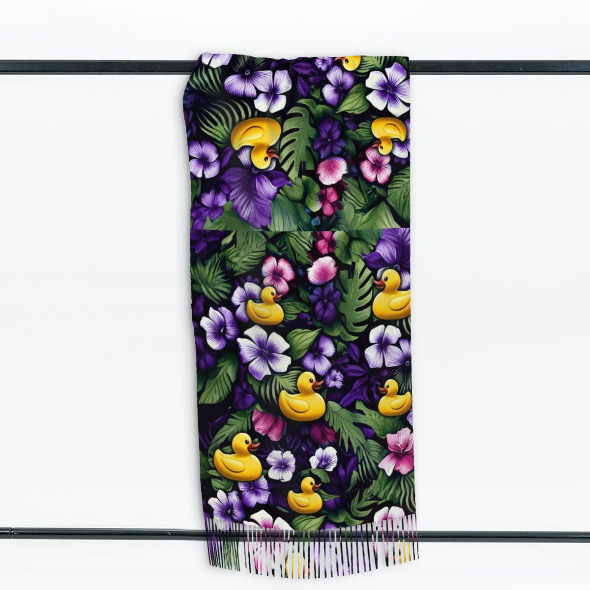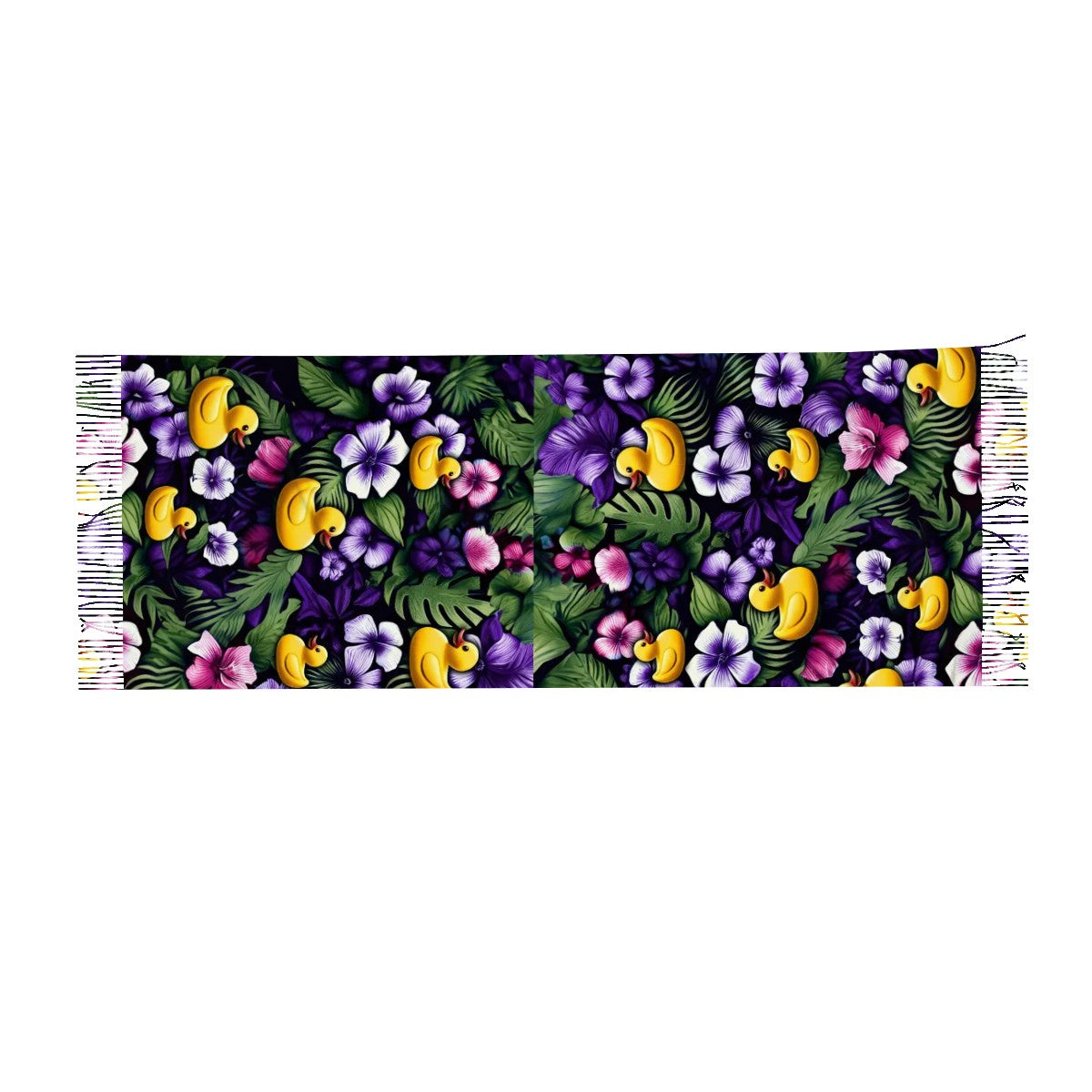 Ready to take duck hiding to fashionable new heights? Our Ducky Royal Purple Hawaiian Scarf is your go-to cruise accessory for adding a splash of style and a sprinkle of fun to your next sailing. Dotted with cheerful rubber ducks peeking out from vivid purple and white tropical flowers, this scarf captures the spirit of island vibes and playful surprises—just like your favorite duck drops at sea.