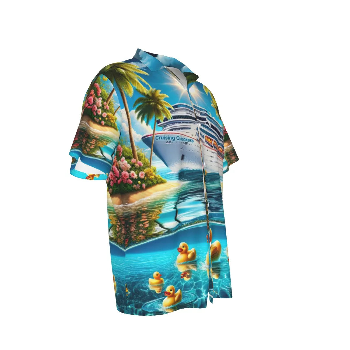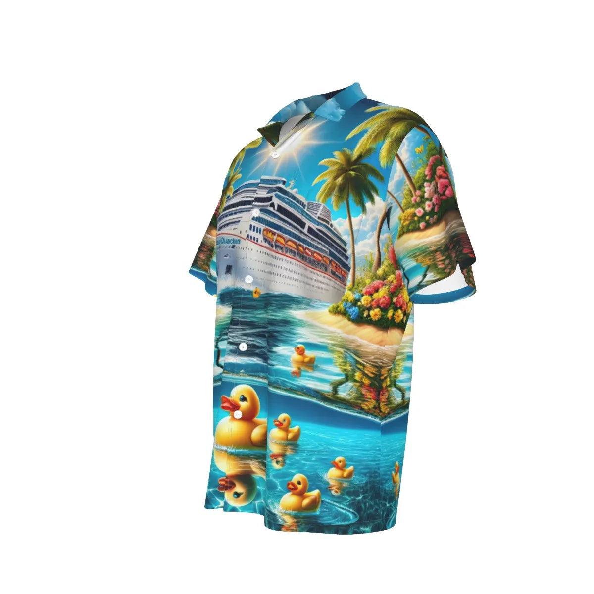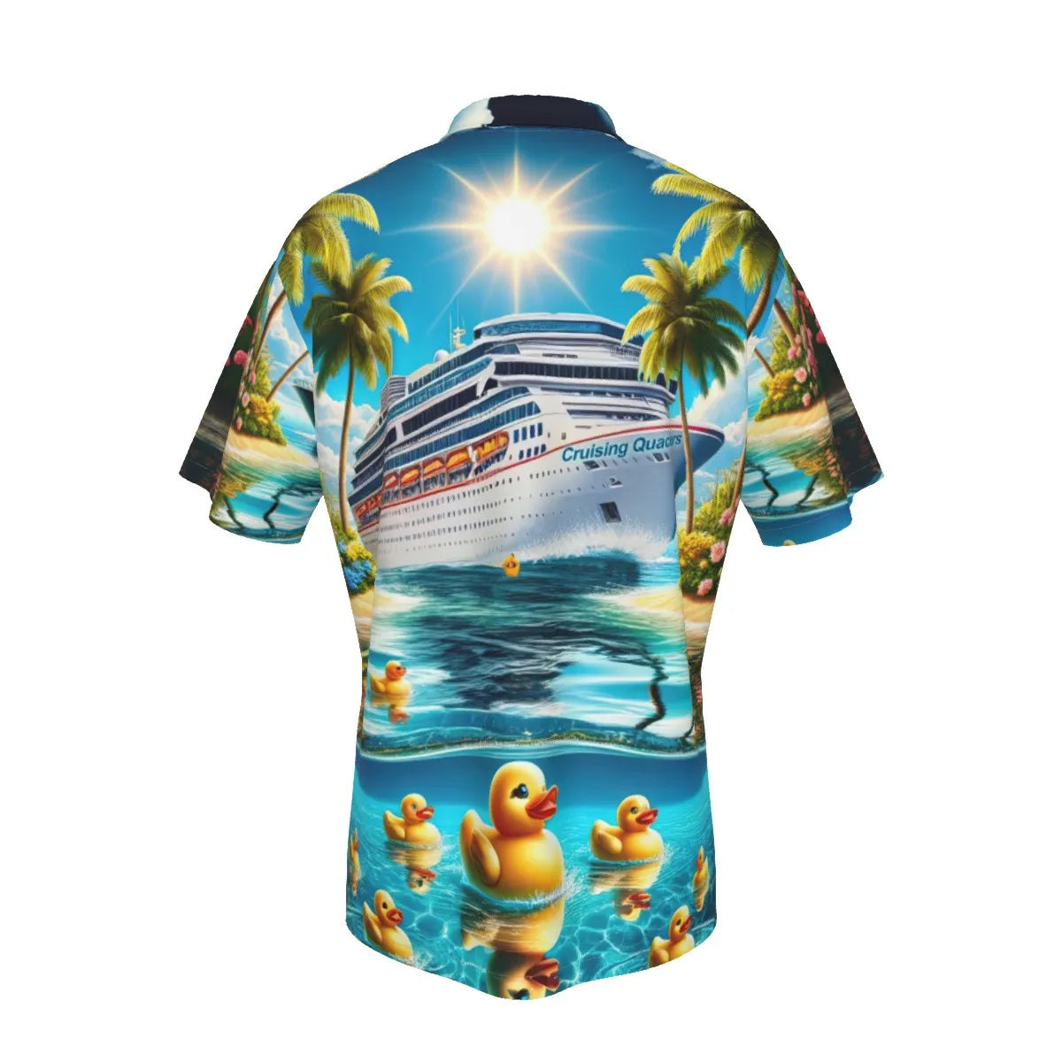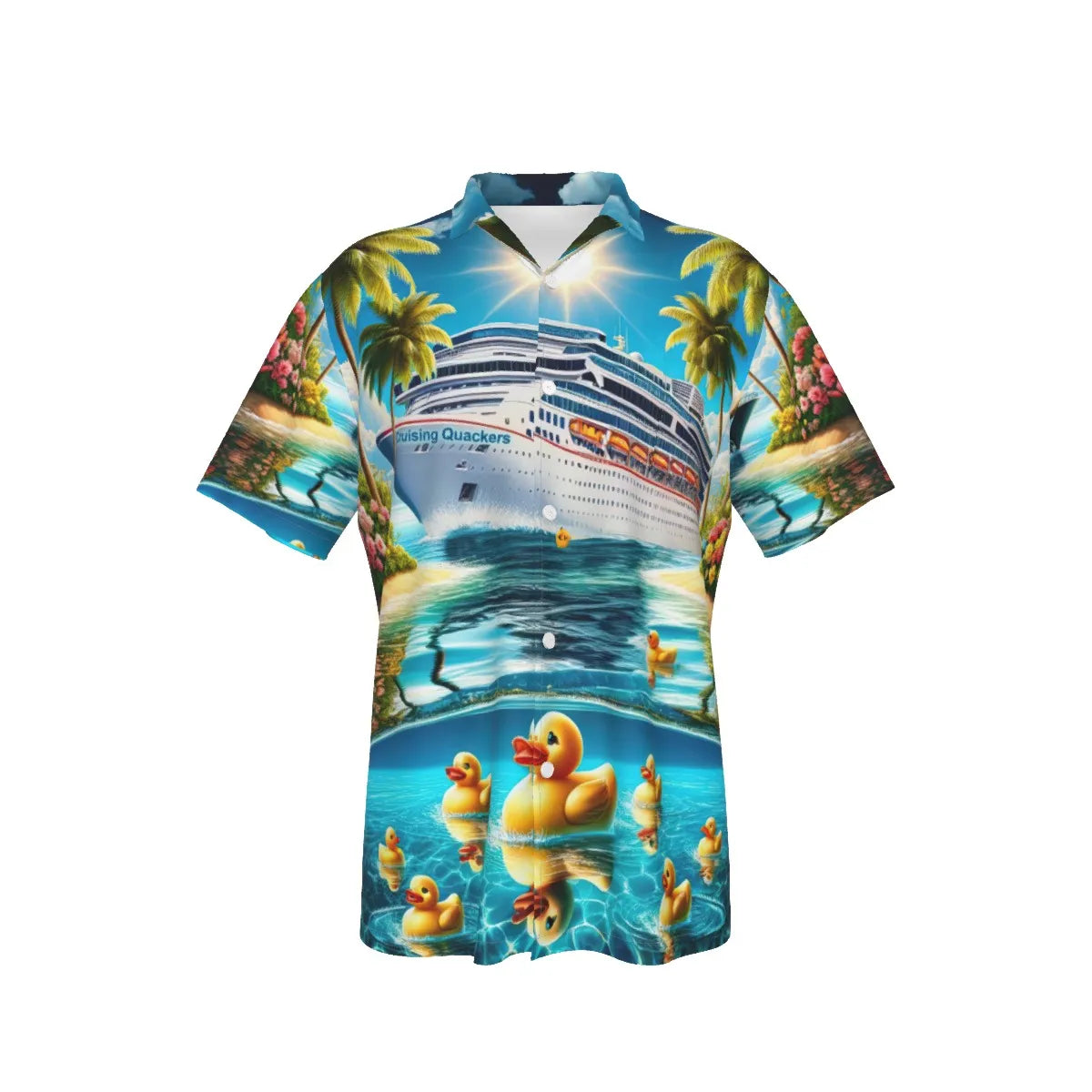 This vibrant shirt features a picturesque scene of a majestic cruise ship amidst a tropical paradise, complete with rubber ducks merrily floating along the azure waters. The lively mix of swaying palm trees, and vivid florals makes this the perfect attire for anyone engaged in the playful pursuit of duck hiding on the high seas. Wear it to the next shipboard meet-up or while lounging on the sun deck, and you'll be the talk of the cruise!