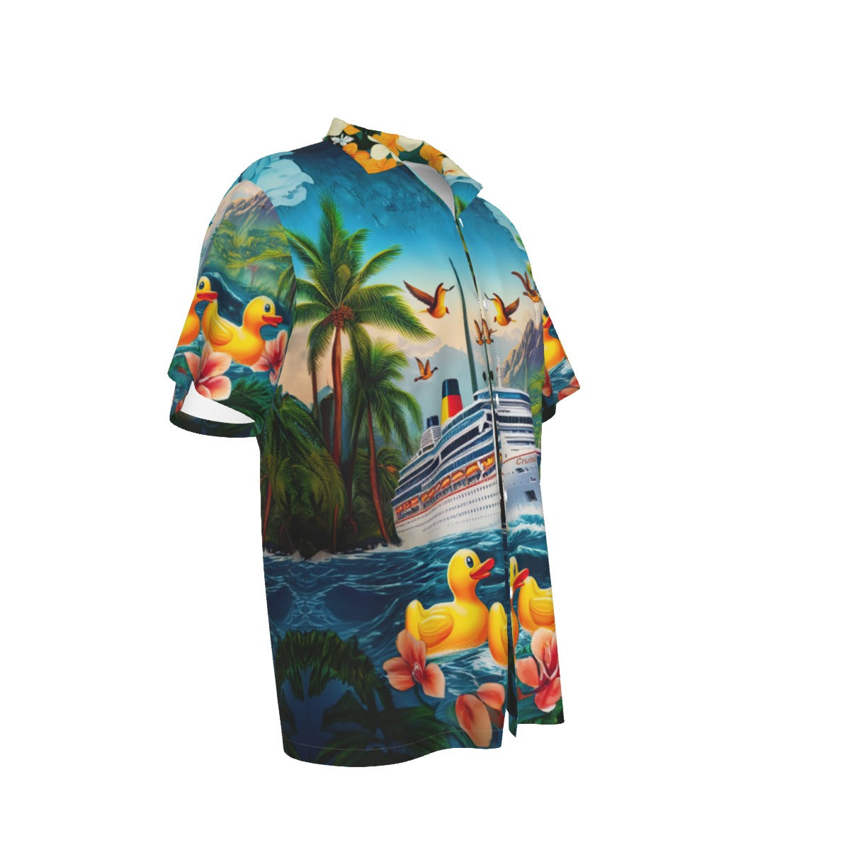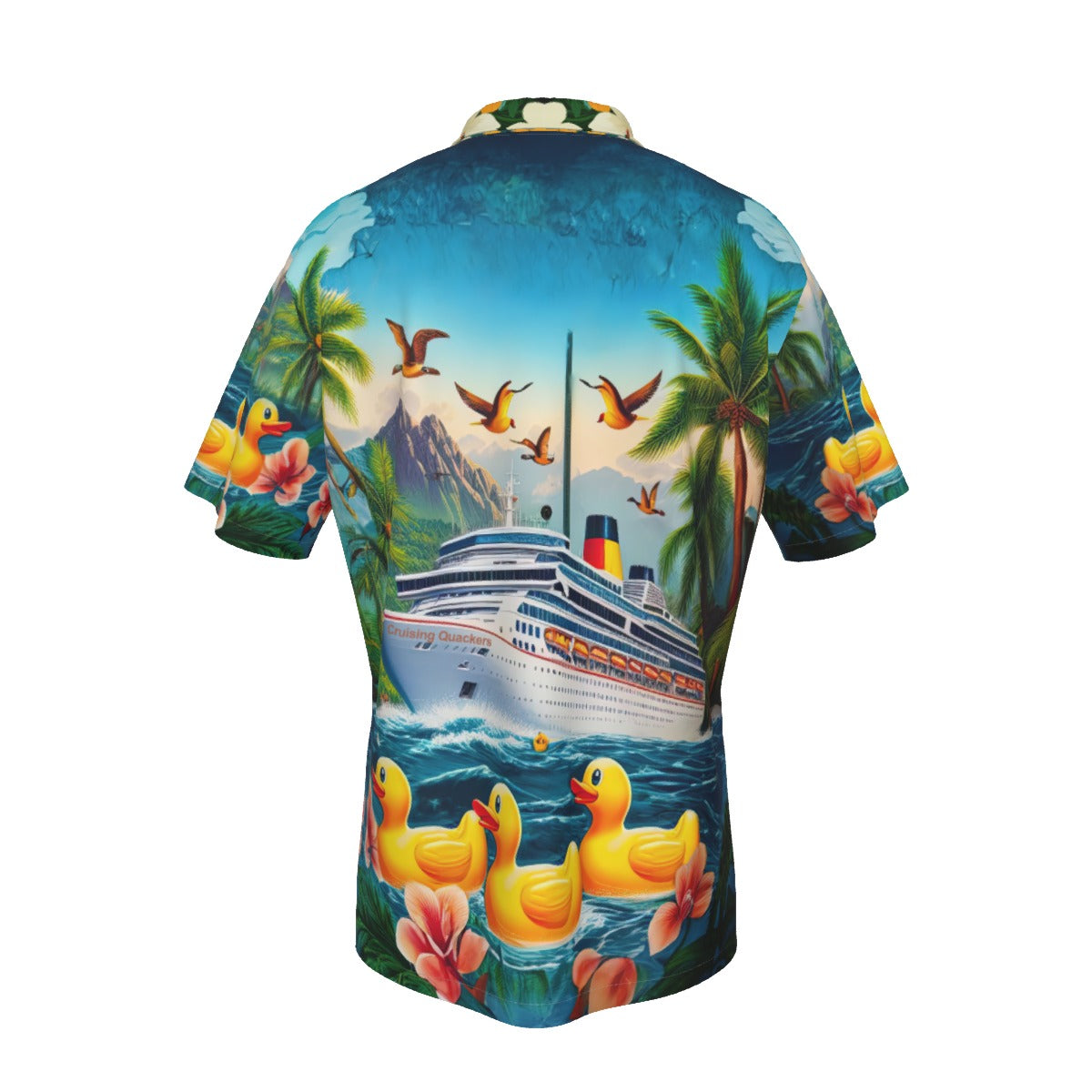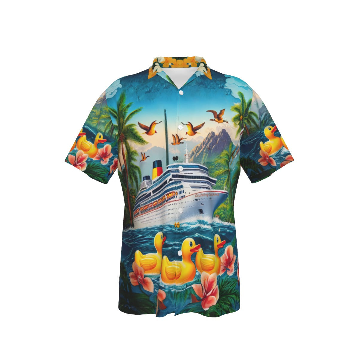 This vibrant shirt features a picturesque scene of a majestic cruise ship amidst a tropical paradise, complete with rubber ducks merrily floating along the azure waters. The lively mix of soaring seabirds, swaying palm trees, and vivid florals makes this the perfect attire for anyone engaged in the playful pursuit of duck hiding on the high seas. Wear it to the next shipboard meet-up or while lounging on the sun deck, and you'll be the talk of the cruise!