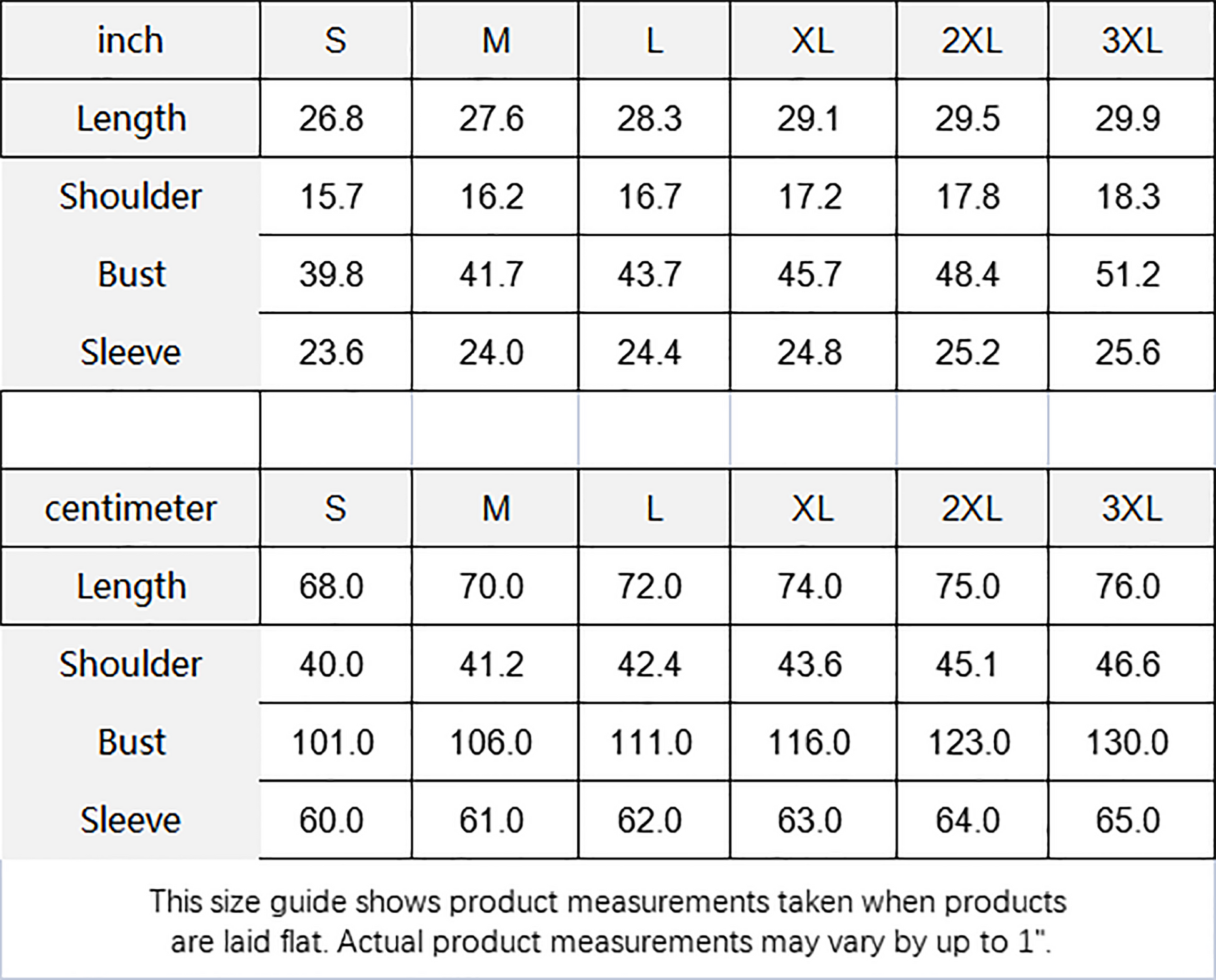 This size guide shows product measurements taken when products are laid flat. Actual product measurements may vary by up to 1".