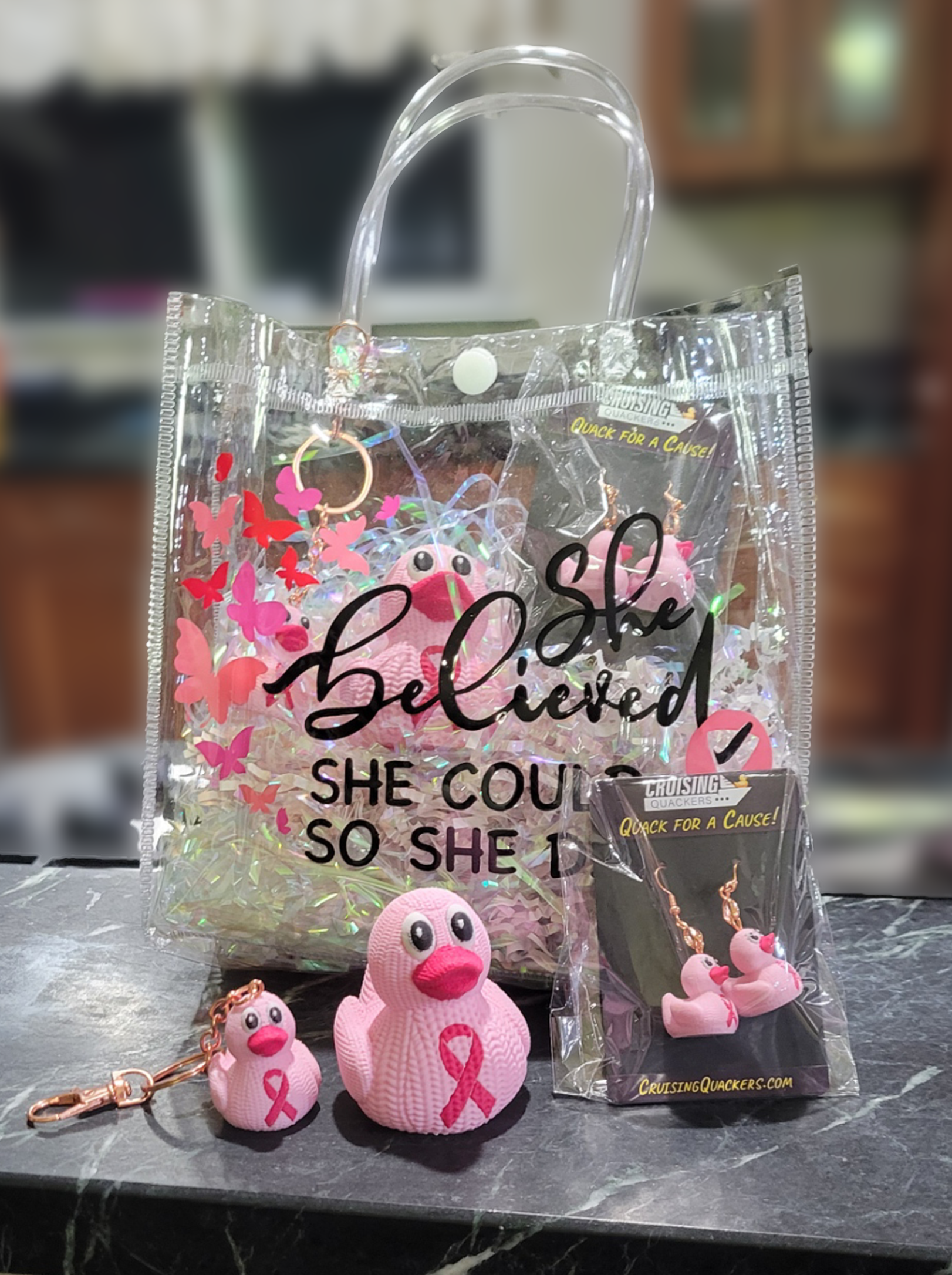 - Breast Cancer Awareness Gift Pack: Perfect for a Breast Cancer warrior, this inspiring set features one standard 2.5-inch duck, a matching set of Breast Cancer Awareness earrings, and a 1.4-inch keychain—beautifully packaged in a clear keepsake bag that reads “She believed she could, so she did” celebrating courage, strength, and hope while supporting the cause.