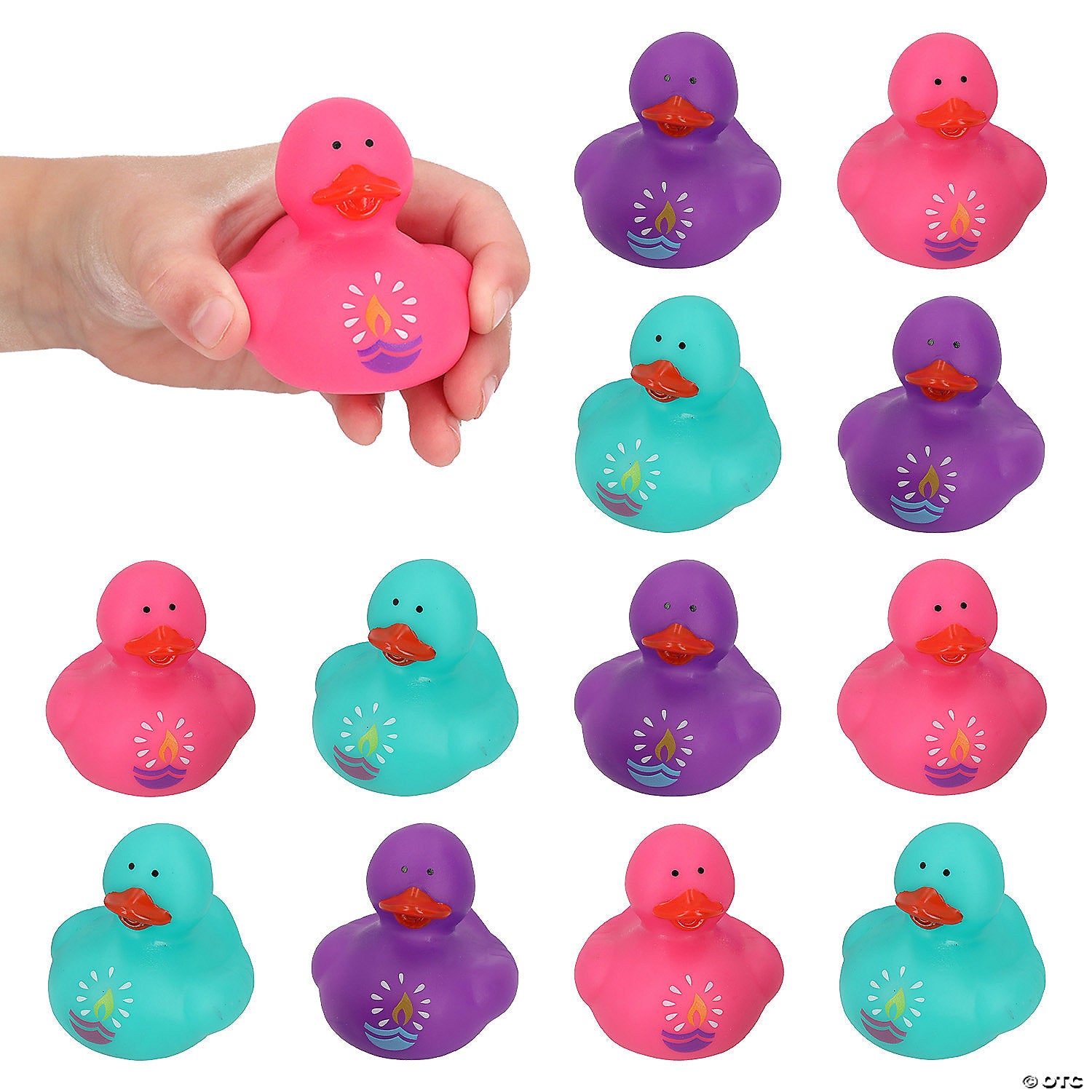 Each duck features a printed candle flame inside a lantern (diya) symbol, representing light over darkness.