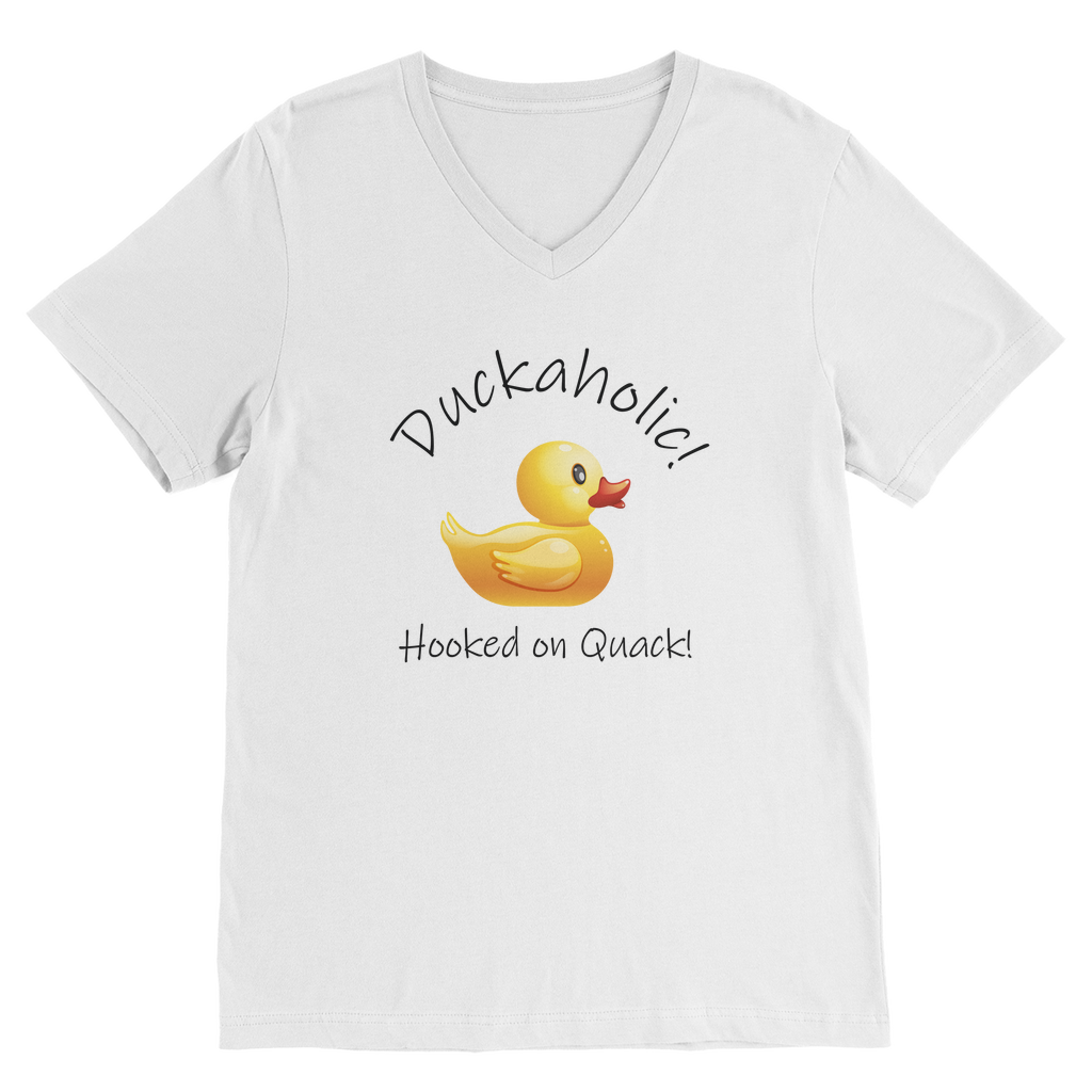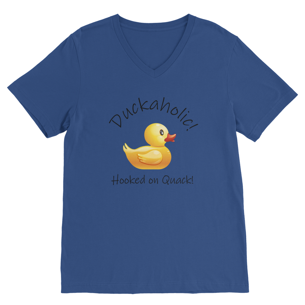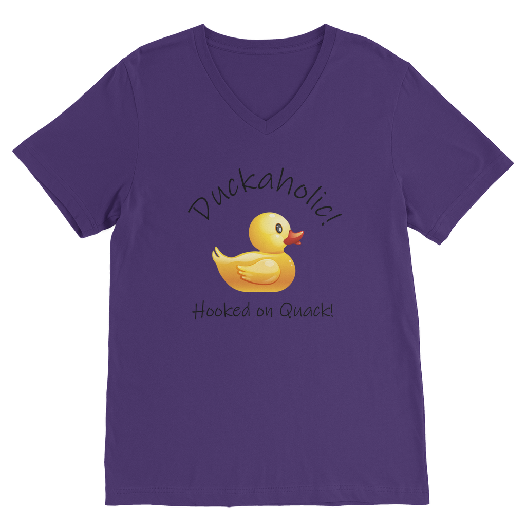 Be 'hooked on quack' with this classic v-neck t-shirt! Perfect for any duckaholic's wardrobe, this shirt shows that you’re not afraid to 'dive' into your obsession. So put it on, 'quack' up your style, and get ready to hunt those pesky ducks!