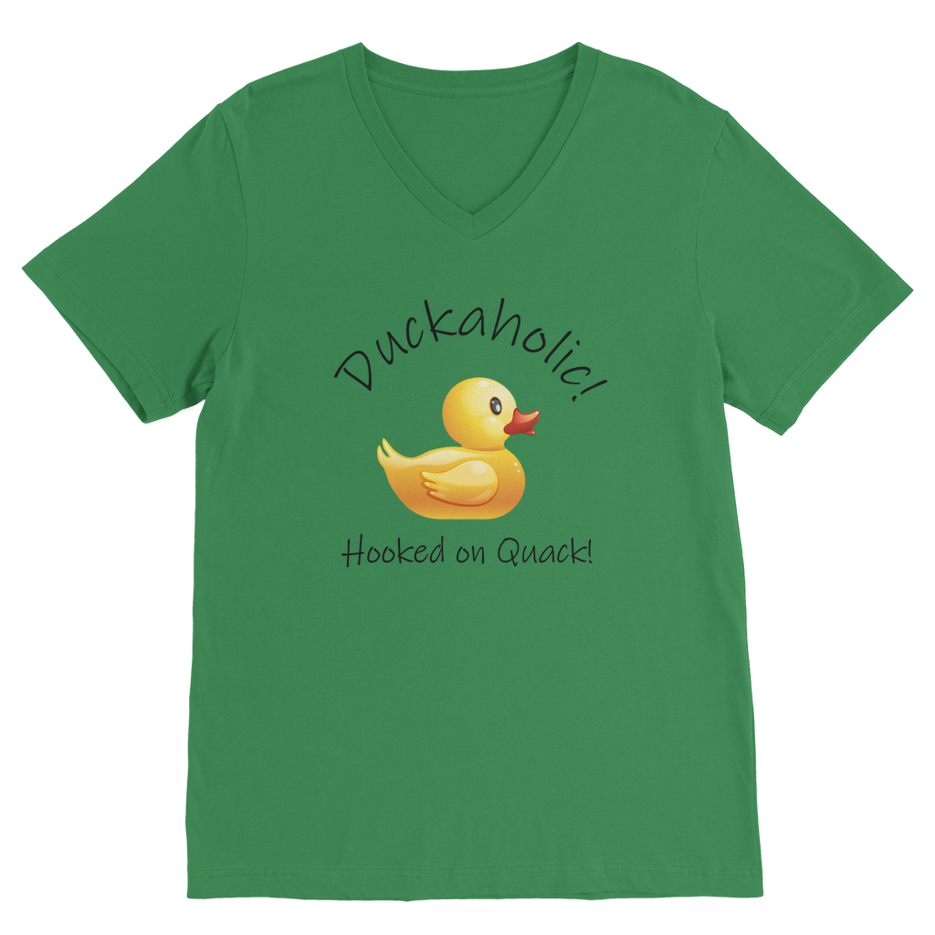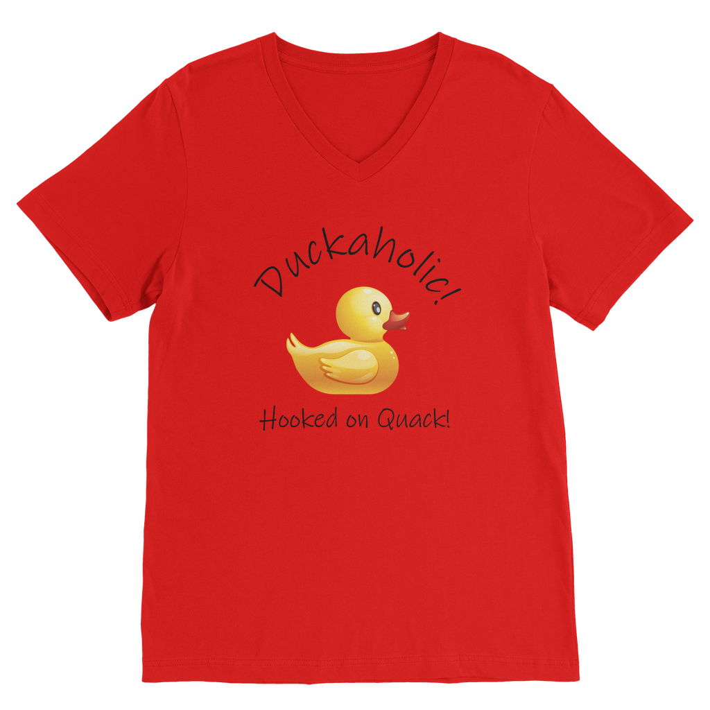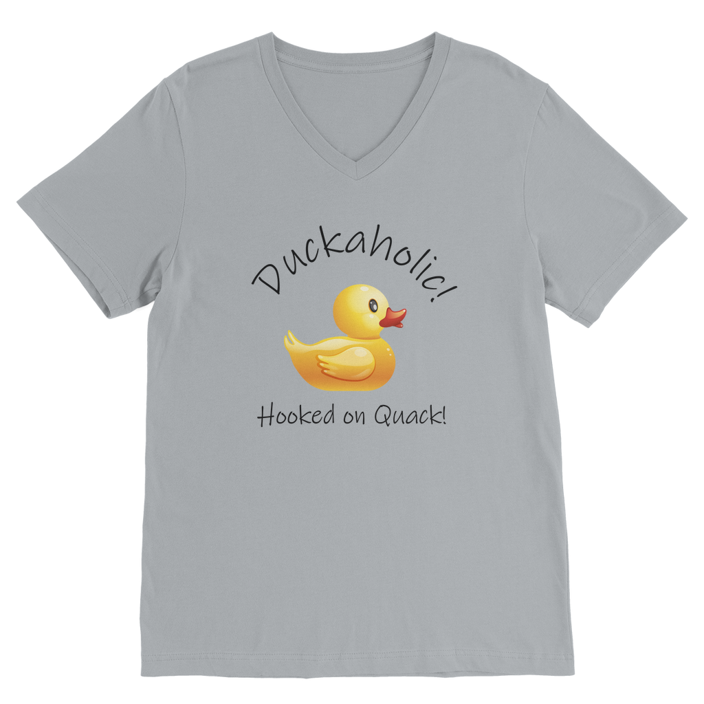 Be 'hooked on quack' with this classic v-neck t-shirt! Perfect for any duckaholic's wardrobe, this shirt shows that you’re not afraid to 'dive' into your obsession. So put it on, 'quack' up your style, and get ready to hunt those pesky ducks!