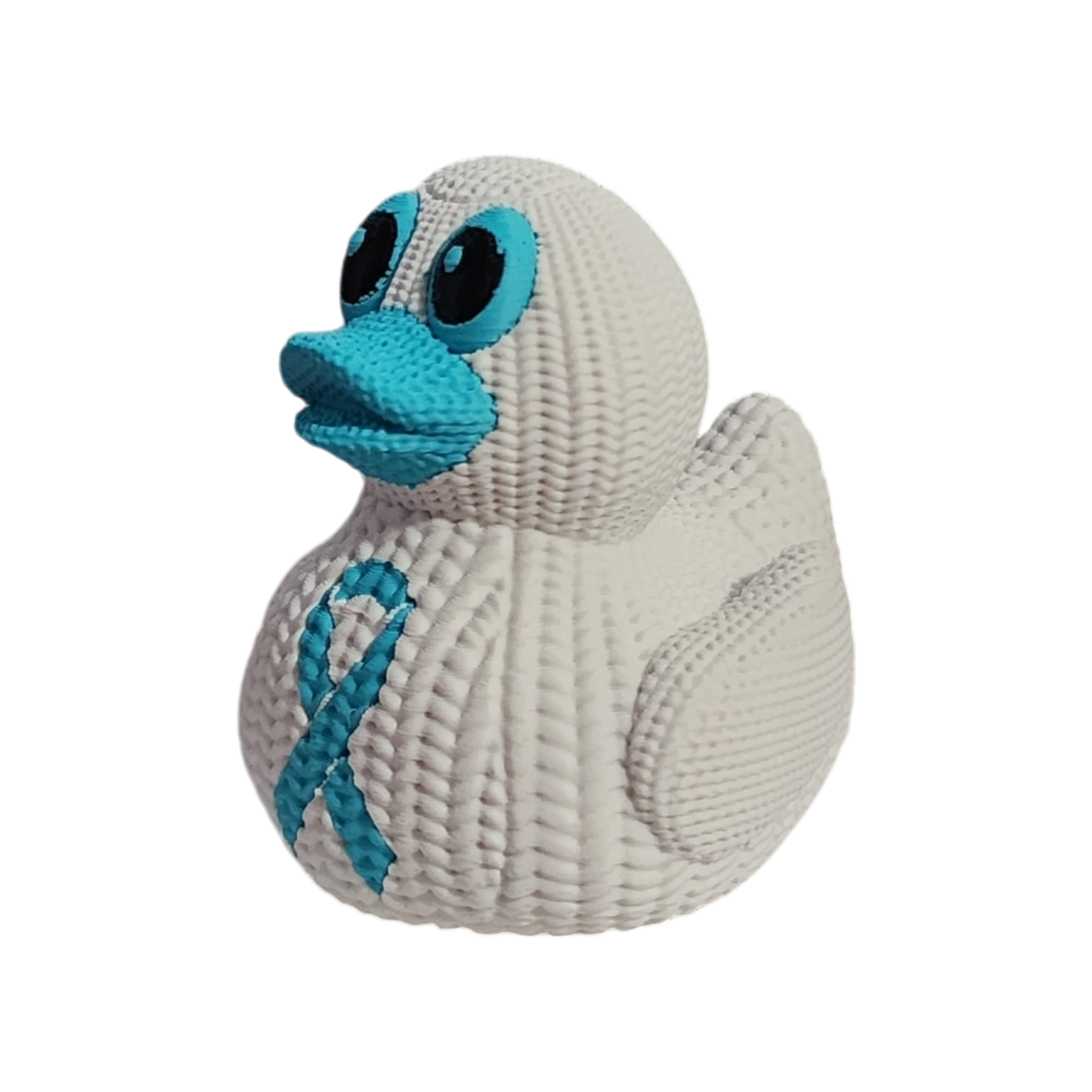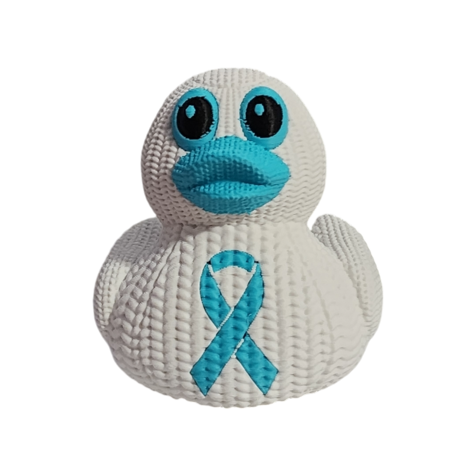 Our Ovarian and Cervical Cancer Awareness Duck is more than just a duck—it's a symbol of hope and strength. Each duck is 3D printed with an intricate crochet texture and proudly features the teal awareness ribbon on its chest, symbolizing strength, hope, and the fight against Ovarian Cancer.